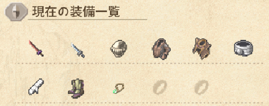 | 重装備 | 盾 | 投擲 | 軽装備 | 二刀流 | 回避 |