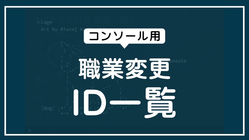 注意 チート等に関しての情報を取り扱っている記事になります。 ゲーム本来の楽しさを大きく損ねる可能性があります。 検証以外でのコンソール使用はおすすめしません。 職業変更コンソールコマンド ChangeJob 職業 下記表のID名を「職業」に入力してくだ... -